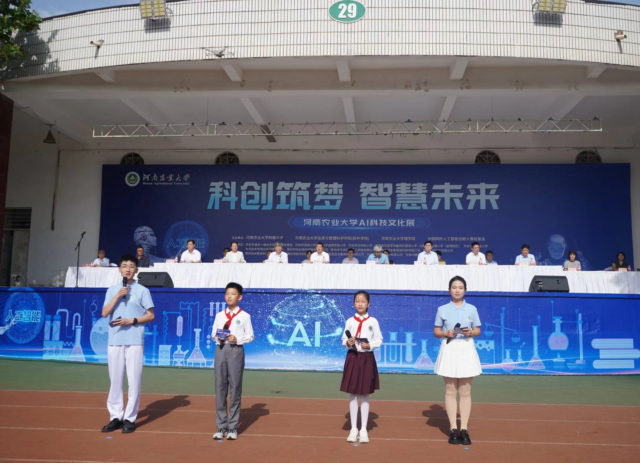携手河南农业大学附属小学、信息与管理科学学院(软件学院)、中国网杯人工智能创新大赛组委会于文化路校区操场举办“科创筑梦,智慧未来”AI科技文化节。