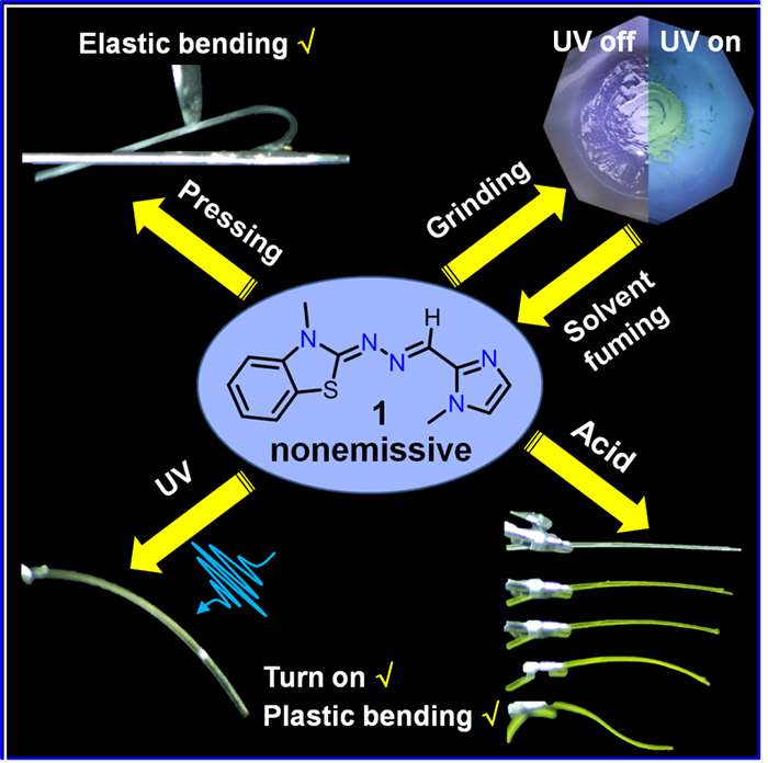 中文成人视频 郑昕博士团队以灵活性的腙键为桥,连接苯并噻唑荧光团和咪唑功能基团,构建了一种新型功能分子。在紫外光作用下,这种分子的细长单晶可以发生快速可逆的塑性机械弯曲运动,并在此过程中伴随着显著的荧光增强(图1)。而在机械外力作用下,此柔性单晶还表现出明显的弹性弯曲。此外,在多种挥发性酸蒸汽作用下,此柔性单晶还可以发生可控的塑性机械弯曲和荧光增强,从而解决了酸诱导机械弯曲过程中晶体会发生荧光猝灭的难题(图2)。