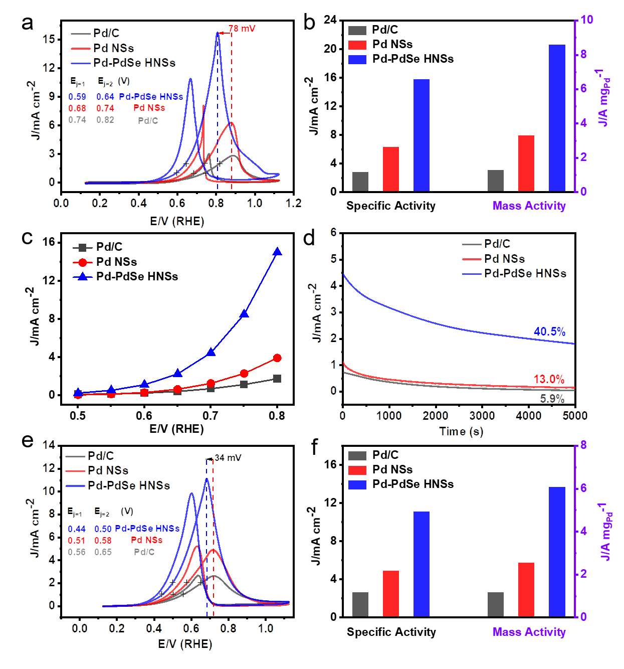 图4. a,c)Pd NSs和 b,d) Pd-PdSe HNSs的电化学原位FTIR光谱;e) Pd NSs和f) Pd-PdSe HNSs在不同电压下的产物分布。