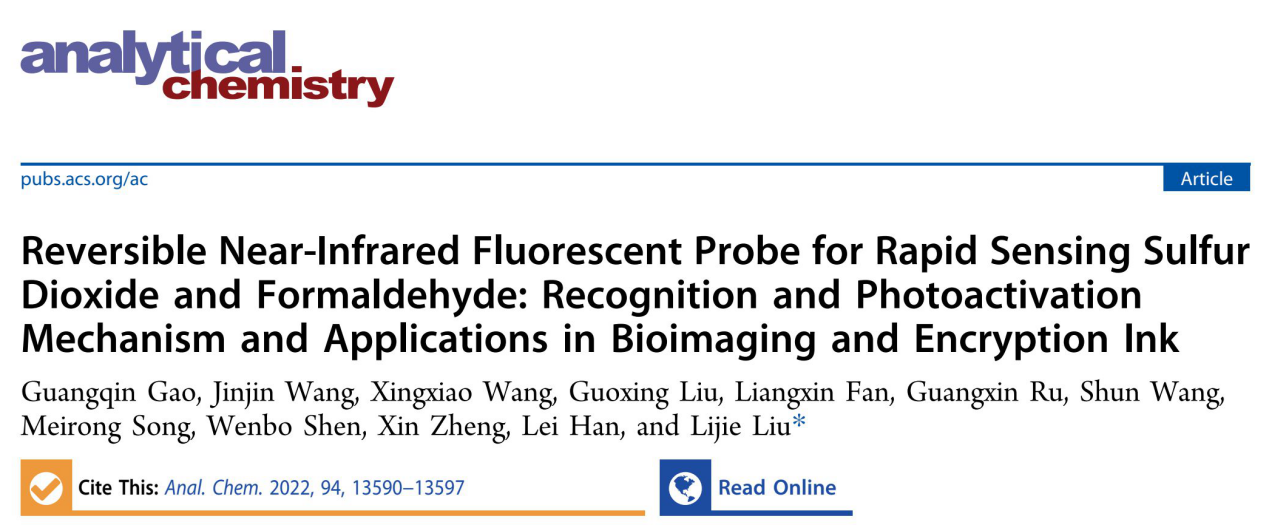 本研究成果以“Reversible Near-Infrared Fluorescent Probe for Rapid Sensing Sulfur Dioxide and Formaldehyde: Recognition and Photoactivation Mechanism and Applications in Bioimaging and Encryption Ink”为题,发表在美国化学会杂志《Analytical Chemistry》(IF: 8.008,中国科学院SCI大类一区TOP)上。高光芹老师为本文第一作者,硕士生汪金金同学为第二作者,刘立杰老师为通讯作者,河南农业大学为唯一通讯作者单位。该项研究得到了国家自然科学基金、河南农业大学拔尖人才计划项目的支持。作者简介: