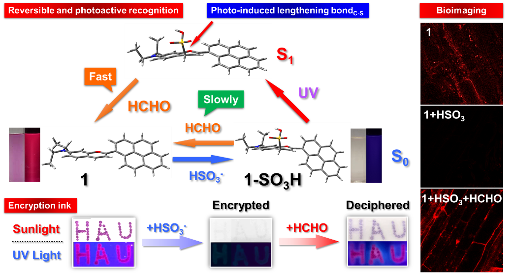 荧光探针因具有高灵敏度、操作简单、非侵入性、非破坏性、生物相容性好等优势而被广泛应用于化学、环境、医学和生物等方面。二氧化硫衍生物及甲醛作为常见污染物及致癌物,近年来备受科研工作者的关注。然而,同时检测二氧化硫衍生物和甲醛的分子体系依然匮乏,并且存在难以捕捉能力弱,发射波长短,组织穿透能力弱,荧光光谱部分重叠等问题。因此,开发具有近红外光发射的荧光探针用于二氧化硫衍生物和甲醛的快速定量检测是一个巨大挑战。本研究设计并制备了一种新型近红外荧光探针,有效地实现了对泡桐根系细胞内的二氧化硫衍生物和甲醛的可逆实时检测(图3)。在加入HSO3-后,该探针的紫色溶液在1.8s内可完全褪色为无色。同时,其荧光信号瞬间消失,检测限为39 nM。在甲醛的作用下,其吸收和荧光能够有效恢复。而在紫外光照射下,该逆反应可被加速84倍,在122 s内恢复到起始的98%,此独特的光活化行为是由于其在光照后激发态(S1)中C-S键的延长导致的。上述变色机理和光活化机制通过了高分辨质谱及理论计算进行了充分验证。基于此,该探针成功地应用于泡桐根系活细胞中二氧化硫衍生物和甲醛快速可逆生物成像,并有效定位了线粒体细胞器。最后,在加密油墨领域的应用进行了尝试,显示出了优异的“开-关”性能(图3)。