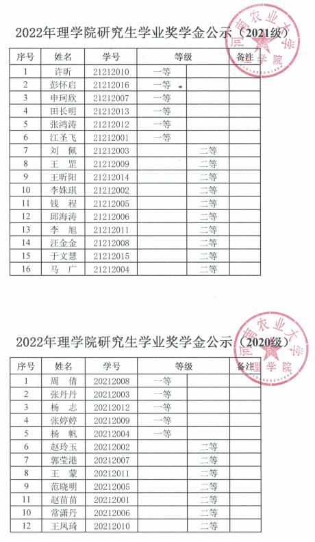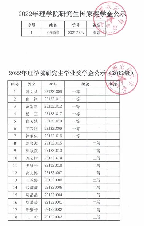 根据《河南农业大学研究生奖助学金管理办法》(校政研〔2018〕11号)文件和《关于开展2022年研究生奖助学金评定工作的通知》精神,按照《中文成人视频 2022年研究生奖学金评定细则》的规定,现将研究生奖学金评审结果予以公示。