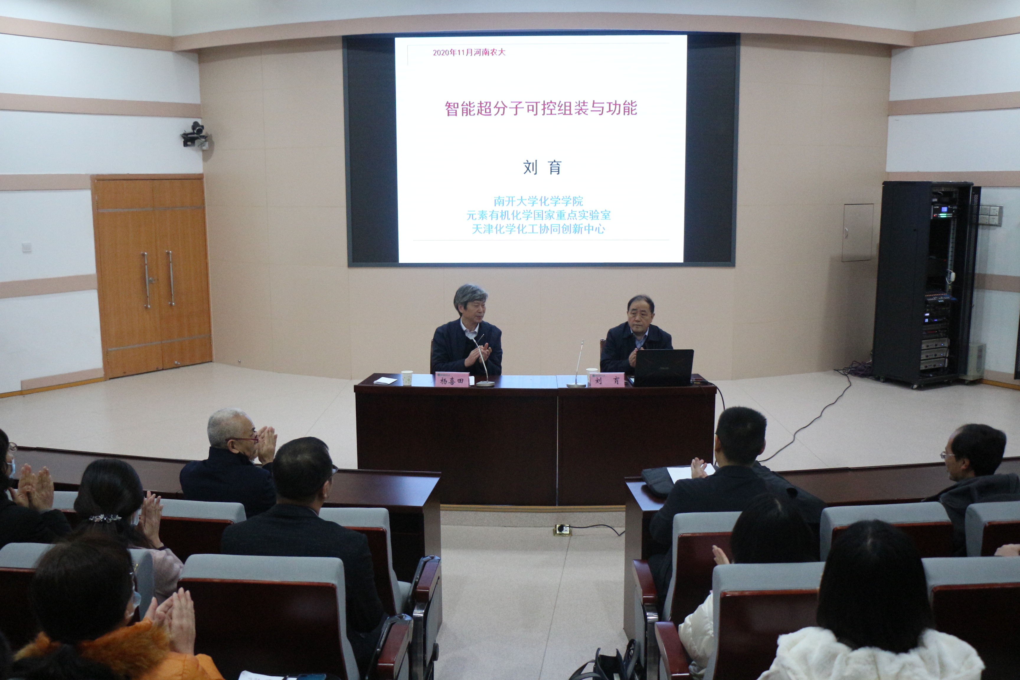 刘育教授作了题为“超分子可控组装及其功能”的学术报告,从超分子基元的合成与分子机器、分子机器的光调控策略、纳米超分子的可控组装及功能三方面详细介绍了团队近年来在超分子领域的功能应用研究成果。他聚焦学科前沿,结合科研实践介绍了在超分子组装方法应用于智能型软材料光致发光、靶向性细胞成像、药物可控释放等领域中的最新研究发现。