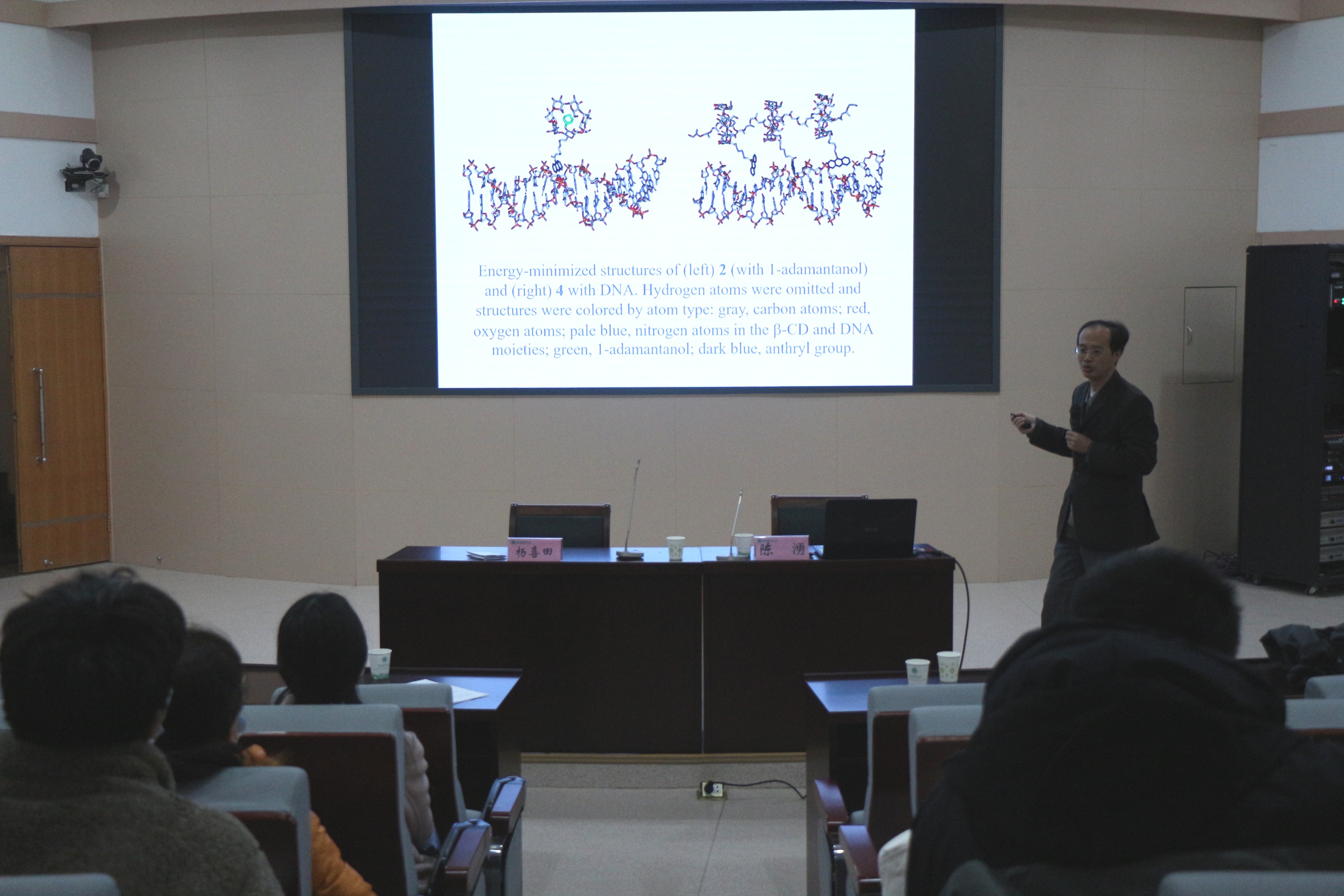 陈湧教授以“大环主体与生物大分子组装体的构筑与功能”为题为中文成人视频 师生作报告。他基于环糊精的分子识别,对单修饰环糊精的分子识别、桥联双环糊精的分子多重识别、杯芳桥联环糊精的协同多点识别进行了详细讲解,并系统介绍了基于环糊精的分子组装问题。